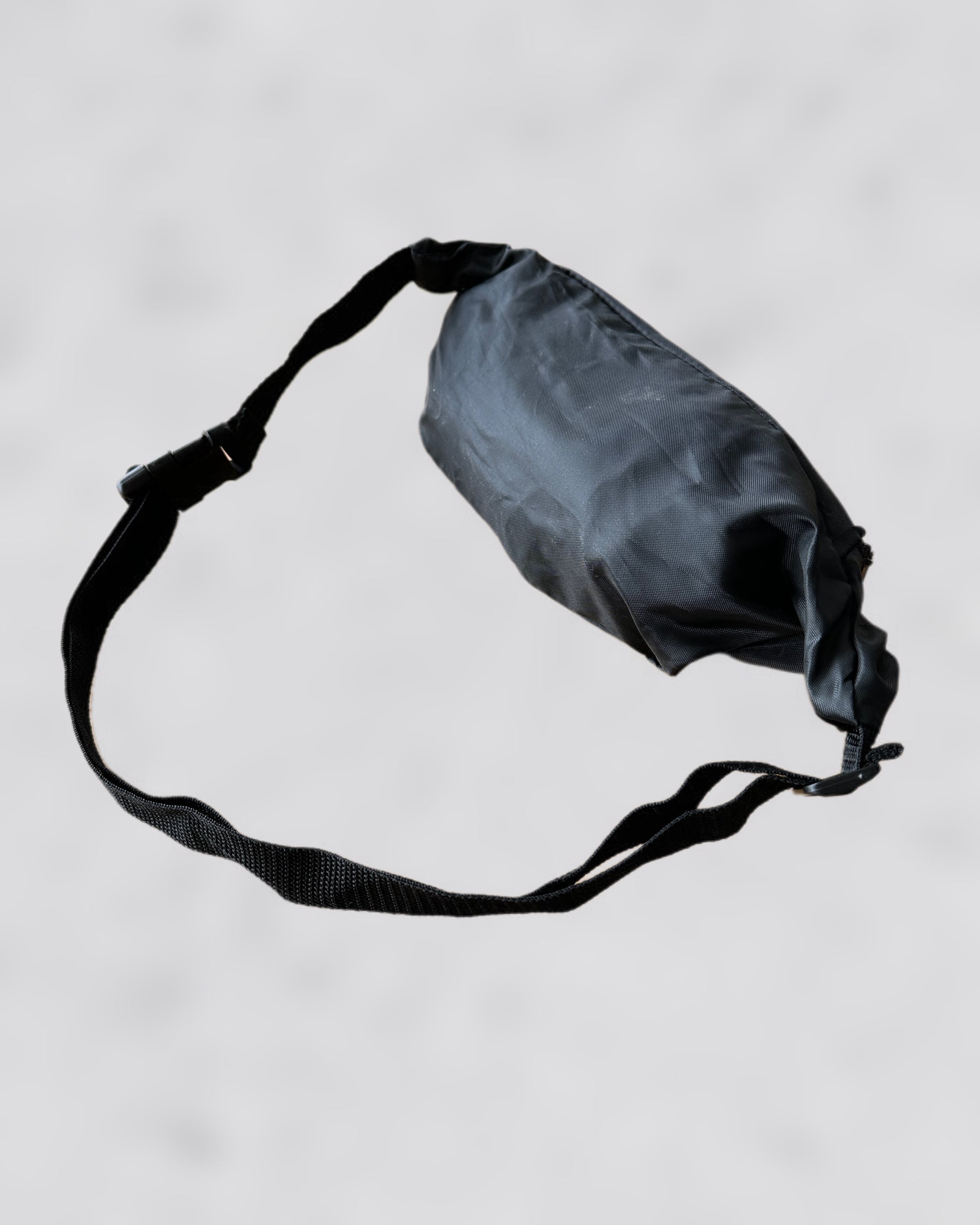 Schwarze Gürteltasche mit Front Zip Tasche und TESTO RENAISSANCE Siebdruck.